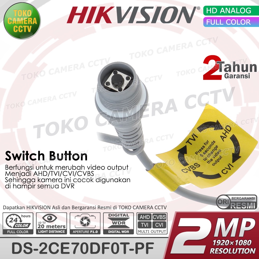 -High quality imaging with 2 MP, 1920 × 1080 resolution -24/7 color imaging with F1.0 aperture -3D DNR technology delivers clean and sharp images -READY LENSA 2.8 mm dan 3,6mm silakan pilih divarian produk -Up to 20 m white light distance for bright night imaging -One port for four switchable signals (TVI/AHD/CVI/CVBS) -GARANSI HIKVISION 2 TAHUN SERVICE DAN SPARE PART -BELUM TERMASUK ADAPTOR