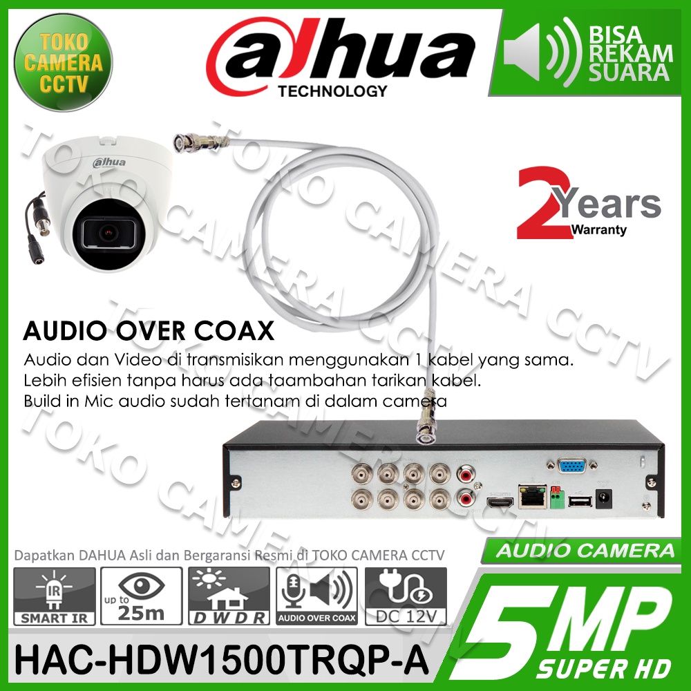 Notes : Untuk Audio di kamera ini hanya support di beberapa tipe DVR DAHUA Pastikan DVR anda sudah support resolusi 5MP,jika di pasang di DVR yg 1080p(2MP) maka tidak akan tampil gambar. Jika dipasang di DVR yg belum support Audio via Coaxial,maka hanya akan tampil gambar saja.
