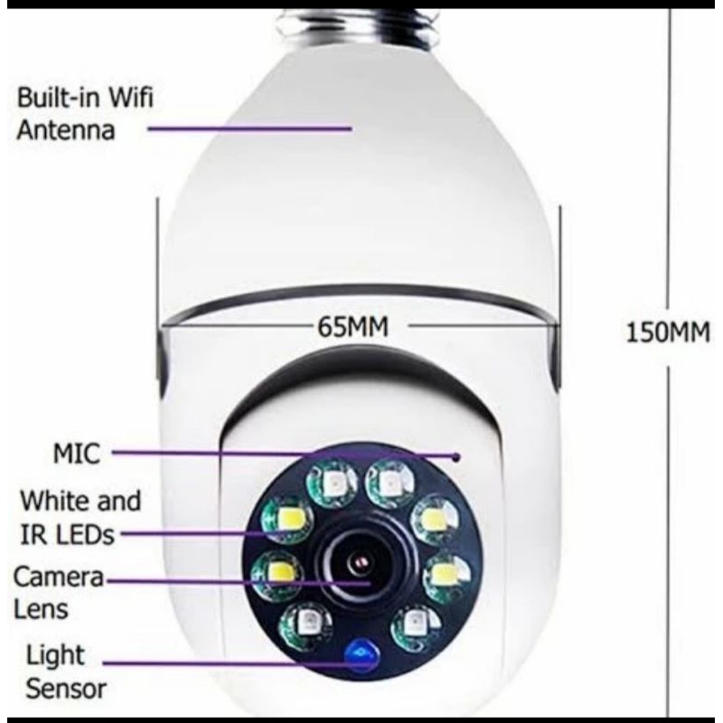 Fitur : - Komunikasi dua arah. - Sensing Movement / Motion Detector - Mudah dipasang, tinggal dipasang disocket lampu - Nyala kan Motion Detector dan dapatkan notifikasi-nya - Hasil rekaman di memory microsd ( ada varian pas order ) - kamera putar 360 derajat PTZ