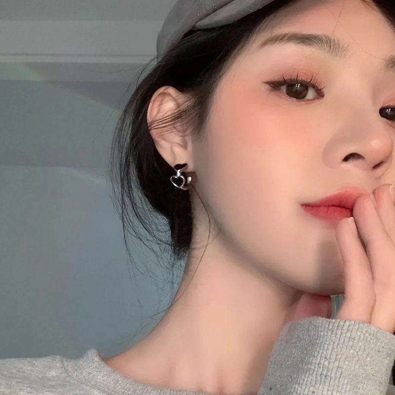 Aksesoris Fashion > Anting > Kami Bunga Korea s925 Perak Glossy Hitam Jantung Hoop Anting Untuk Wanita Perempuan Elegan Cinta Hati Klip Anting-Anting Telinga Manset Perhiasan Aksesoris