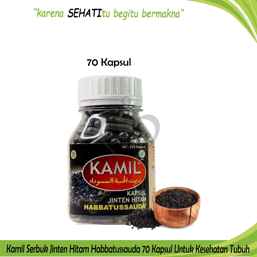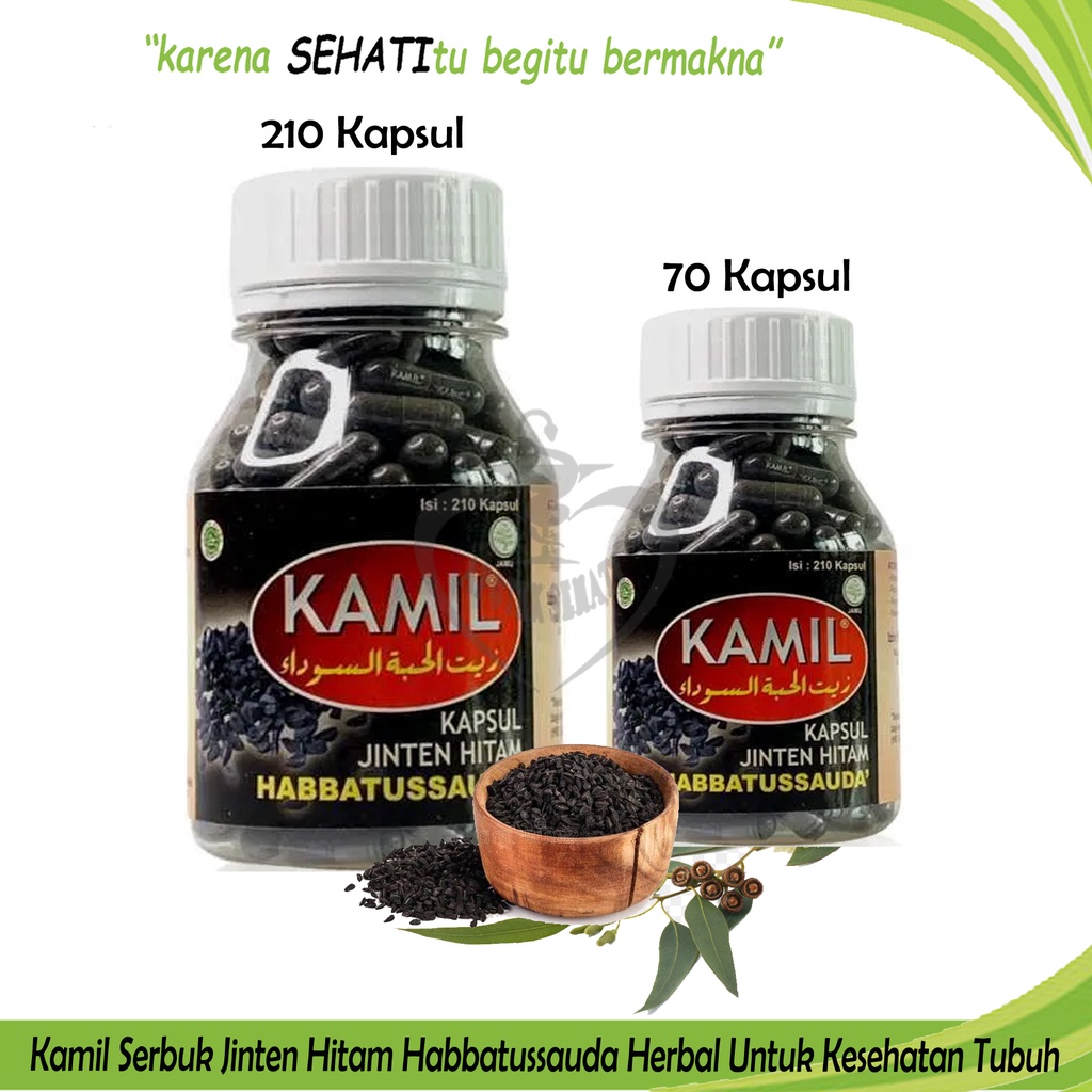 KAMIL jinten hitam terbukti berfungsi sebagai obat penyembuh. Mengkonsumsi KAMIL jinten hitam secara teratur etiap hari. Indikasi : - Untuk masuk angin & capek-capek - Menormalkan tekanan darah - Mengurangi mual pada ibu hamil - Meningkatkan produksi ASI - Mencegah & mengobati kista Dosis dan Aturan Pakai : Untuk pencegahan 1-2 kapsul / hari Untuk pengobatan 3-4 kapsul / hari.