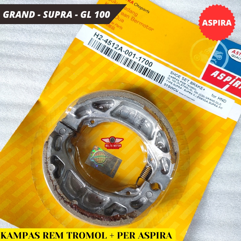 KAMPAS REM TROMOL + PER / MERK ASPIRA ASTRA OTOPART Kode Part : H2-4512A-001-1700 Untuk Jenis Motor : -GL 100 CDI - GL 100 PLATINA -WIN -GRAND/ASTREA -SUPRA X -SUPRA FIT -LEGENDA -C70/700