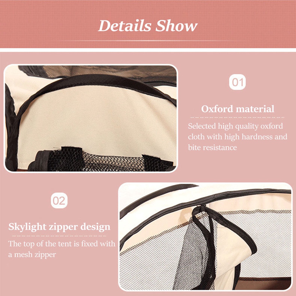 Kegunaan : 1. Menjaga agar hewan peliharaan Anda aman dan aman di dalam maupun di luar ruangan. 2. Desain panel jala 8-sisi untuk kenyamanan dan ventilasi maksimal. 3. Desain penutup mesh yang dapat dilepas khusus untuk memberikan naungan dan keamanan yang lebih baik 4. pintu ritsleting ganda dengan mesh yang dapat digulung dan direkatkan untuk menjaga pintu tetap terbuka agar hewan peliharaan Anda mudah keluar masuk. Bagian atas juga dapat dibuka lebar apabila anda ingin menaruh makanan dan lainnya. 5. Menyiapkan dalam hitungan detik dan tidak memerlukan perakitan; melipat kembali rata ketika tidak digunakan untuk memudahkan membawa dan menyimpan. 6. Sangat ringan namun ekstra kuat membuat perjalanan dan mobilitas sangat mudah.