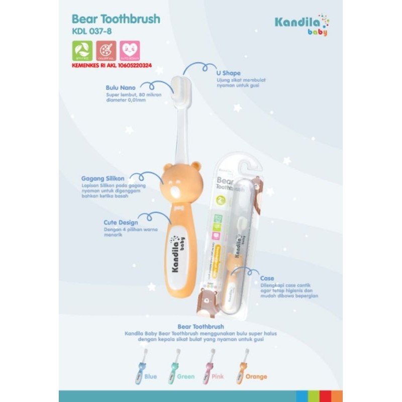 Kandila Bear Tootbrush kdl 037-8 Dirancang khusus untuk mulut dan gusi bayi dengan kepala bulat yang lembut . Desain kepala dan gagang sikat yang nyaman di gunakan untuk si kecil..