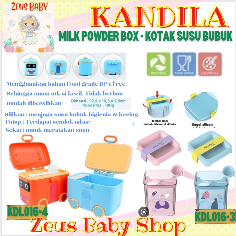 KAndila KDL016-3 Car Kandila KDL016-3 Merupakan kotak susu bubuk yang dilengkapi sendok takar, sekat takar, dan tutup kedap udara. Produk ini menggunakan bahan BPA-free yang sangat aman untuk Sikecil. Desainnya cantik dengan warna menarik dan mudah dibersihkan.
