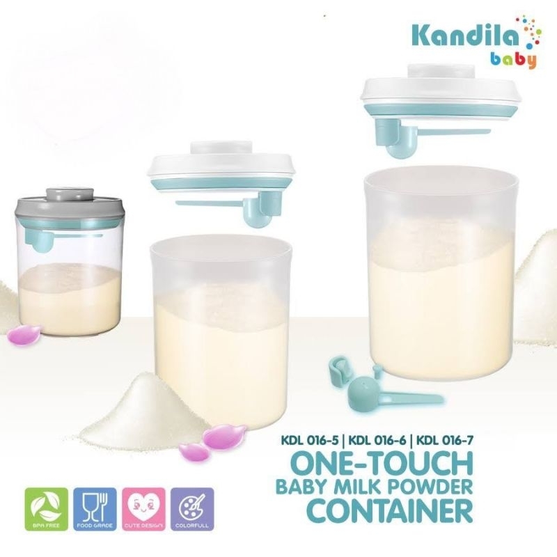 ONE-TOUCH AIR TIGHT BABY MILK POWDER CONTAINER KANDILA adalah wadah susu bubuk dengan fitur one-touch yaitu cukup menekan 1 tombol untuk membuka wadah dengan mudah. Produk ini kedap udara sehingga produk susu Sikecil terjaga kualitasnya tetap higienis dan kering sehingga lebih awet. Dilengkapi juga dengan sendok takar (5Gr) yang dapat dipasang pada bagian penutup wadah agar tetap higienis dan tidak mudah hilang. Apabila tidak ingin menggunakan sendok bawaan, maka bisa menggunakan penahan silikon untuk menggantung tutup pada pinggir wadah agar tetap higienis ketika digunakan.