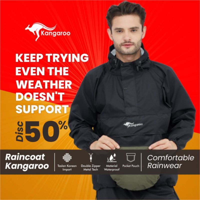 -All Size - Bahan Taslan Korea Import waterproof dan windproof (Teruji anti air) - Setelan jaket dan celana - Bahan halus dan ringan - Bagian depan jaket pakai resleting untuk memudahkan pemakaian untuk - Model jahitan full Stick Back - Penutup kepala (hoodie) - Celana menggunakan karet akan mengikuti sesuai ukuran pinggang - Bisa dilipat dalam bentuk tas kecil sehingga mudah dibawa - Original Brand Kangaroo