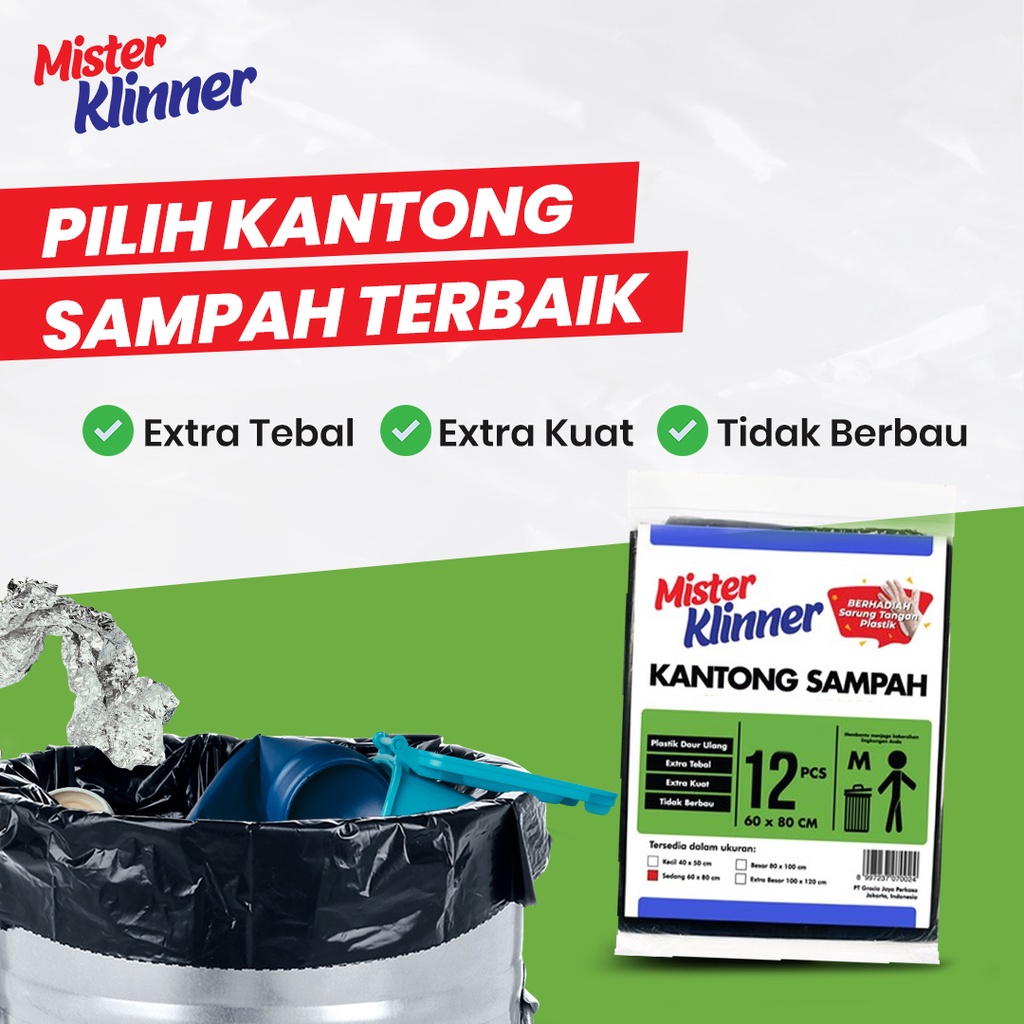 1. KANTONG SAMPAH ( M ) ukuran : 60cm X 80cm Merk : Mister Klinner Isi : 12pcs