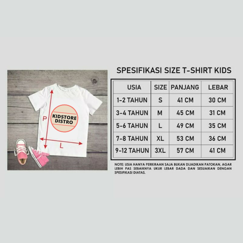 L: (5-6 Tahun) Panjang Kaos 48cm, Lebar Kaos 34cm.