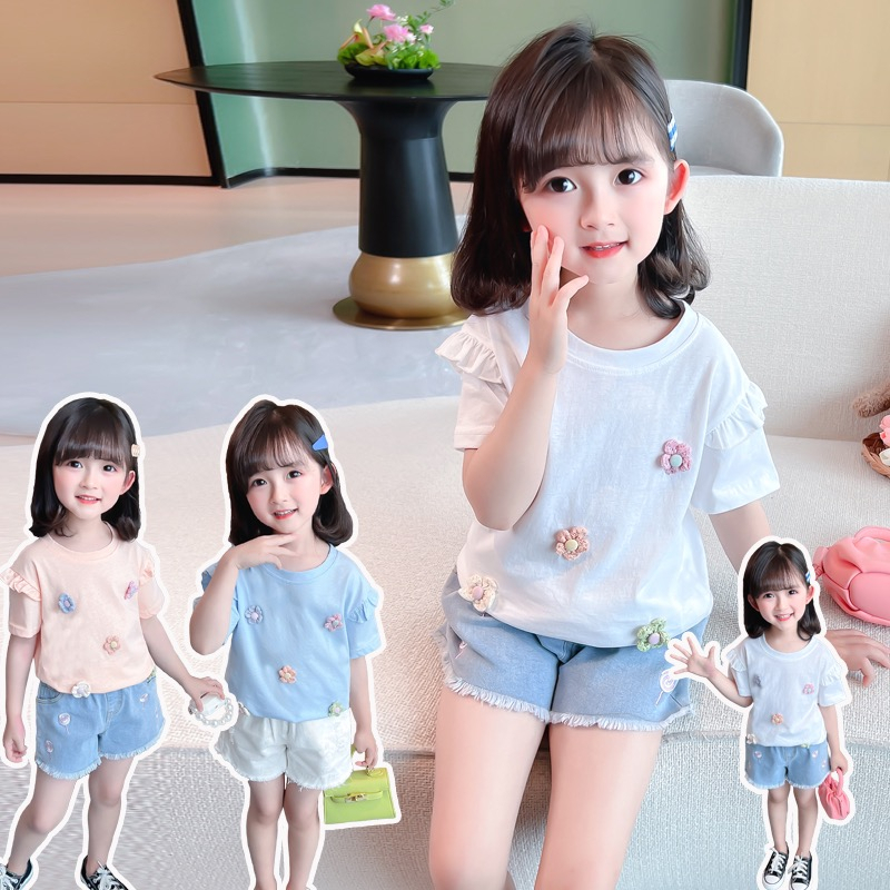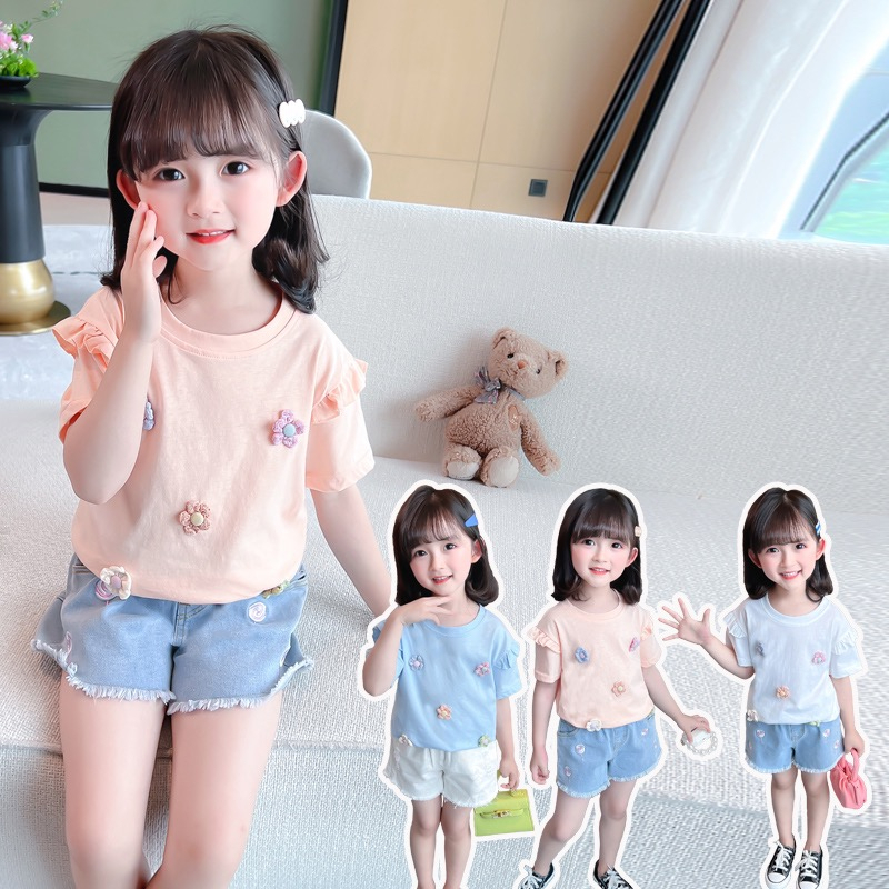 Kaos Anak Perempuan Impor Korea Fashion Lengan Pendek Motif Bunga