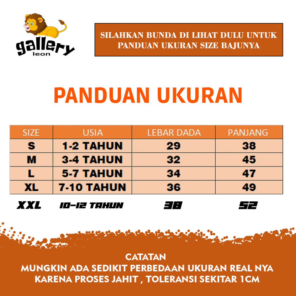 Hi mom and dad Thanks Sudah Mampir Di Etalase Toko Gallery Leon HARAP DI BACA SEBENTAR Sedikit Cerita ini adalah Produk Kebanggan kami dari gallery Leon Yg kita Kasih Branding Dengan Nama LERION untuk Produk Produk Yg kami produksi Sendiri . Jelas kita selalu Kontrol Untuk Kualitas Agar mom & dad bisa Memberikan Produk berkualitas terbaik untuk Anak Tercinta Bahan Kain Kaos Kita Memilih Untuk Pakai Cotton Combet 30 S ASLI YUPS ASLI murni combet 30S premium tanpa campur bahan lain . Karena Bahan katun Combet 30S sangat Pas Untuk Anak Anak Kaos Jadi Adem tidak tebel dan tidak tipis , Mudah Nyerap Keringat , Halus Lembut Tidak Kaku Sehingga Si Buah Hati Bakalan Nyaman Banget Pakai Kaos Produk Kami