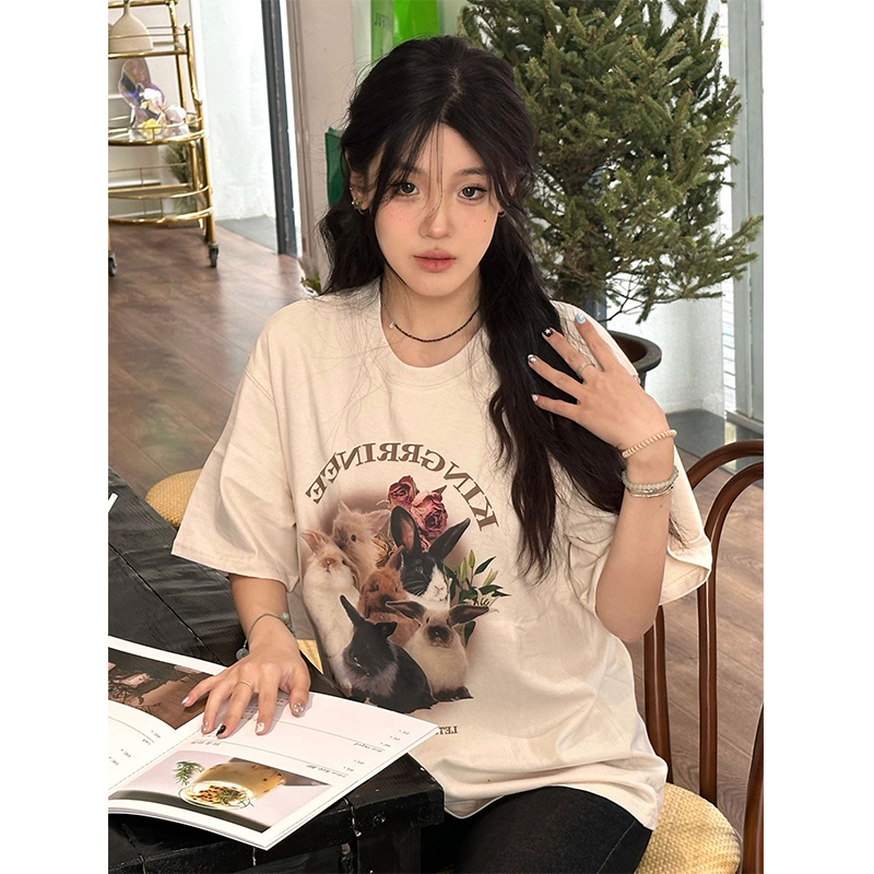 Detail kaos baju wanita oversize lengan pendek korean style rabbit pattern printing T-shirt doodle kaos hitam