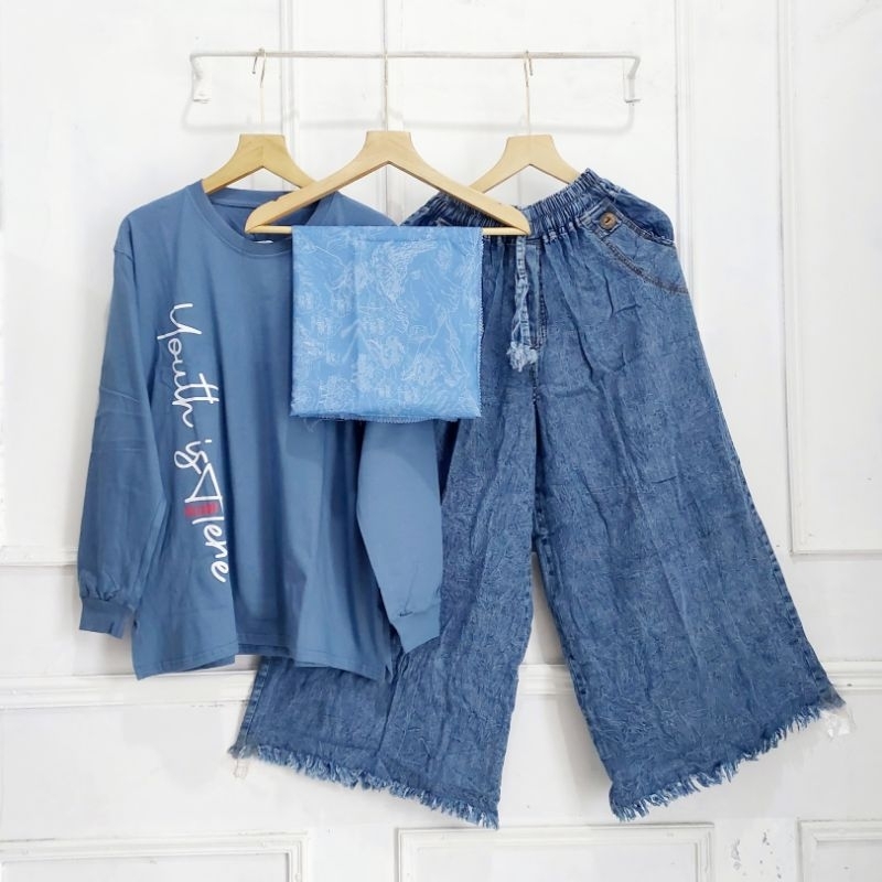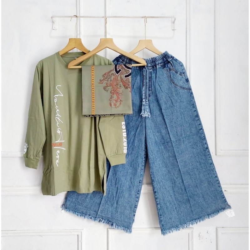 Pakaian Wanita > Set > Set Wanita > Kaos Combed Oversize Jumbo//Kaos Jumbo Set Kulot Jeans Jumbo//Set Kulot Jeans Jumbo Ld 120//Set Wanita Oversize JUMBO BB 85