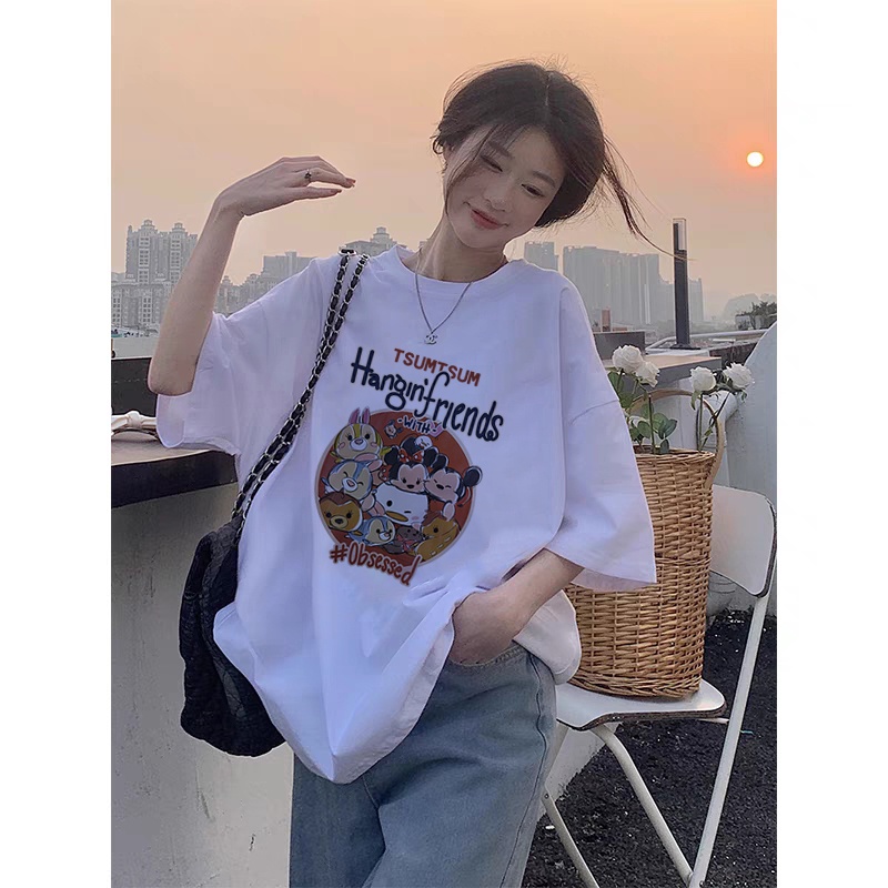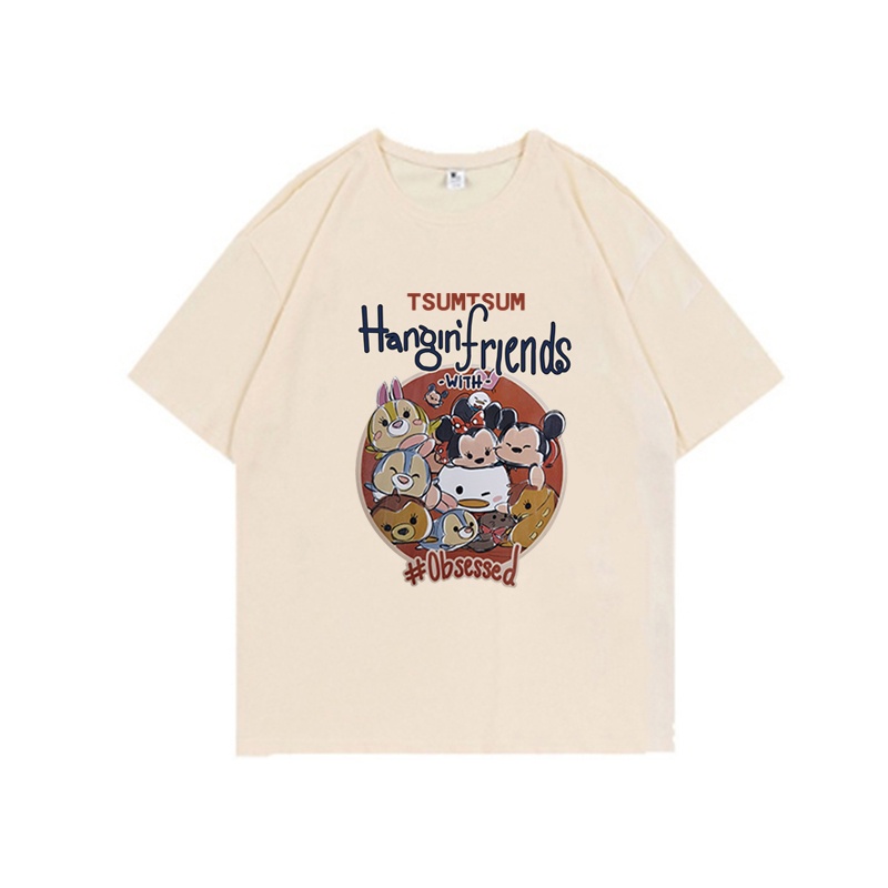 Detail Kaos Couple Korean Style Oversize Letter and Cartoon Pattern Printing Lengan Pendek T-shirt Vintage Kaos Cream