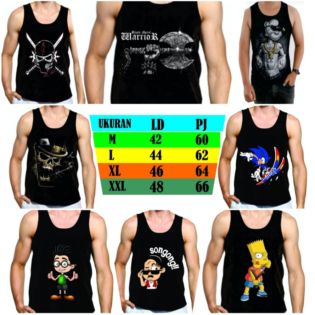SPESIFIKASI GAMBAR: 1.TENGKORAK 2.NINJA 3.KAPAK WARIOR 4.POPEYE 5.Simpsons 6. Sonic 7.Songong 8.Neardy boy Ready stok,harga langsung dari produksi sendiri bahan katun,nyerap air,adem,murah dan berkualitas,bisa cod tersedia size M,L,XL,XXL,XXXL LD(LINGKAR DADA) M- LD 85CM PJG 60CM L - LD 90CM PJG 65CM XL -LD 95CM -PJG 68CM XXL-LD 100CM-PJG70CM M- muat 45kg-50kg L -muat 53kg -57kg XL -muat 60kg - 67kg XXL muat 70kg - 80kg