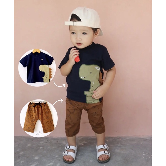 Detail KAOS DINO SUIT Baju Kaos Celana Pergi Jalan Lucu Fashion Anak Bayi Cowok Laki Terlaris Lucu Murah Babeebabyshop