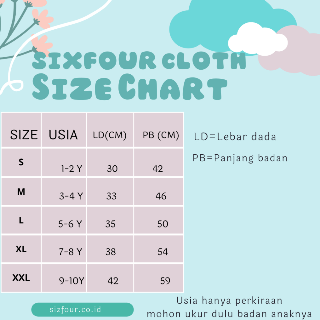 S : LD 30cm PJ 42cm (umur 1-2 tahun) M : LD 33cm PJ 46cm (umur 3-4 tahun)