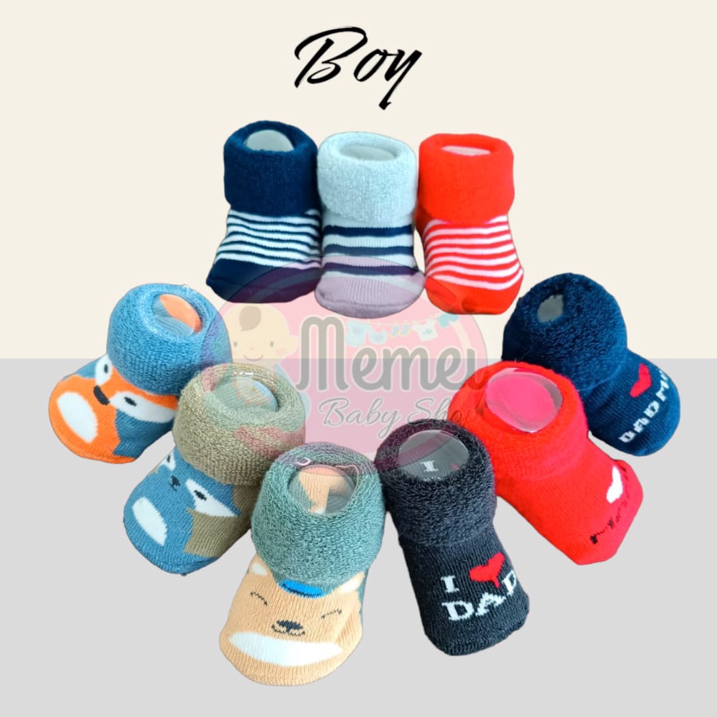 - Bahan: lembut dan halus, nyaman dipakai - Ukuran: standart bayi - Usia: 0 - 6 bulan (tergantung besar anak) - Warna: random - Motif: karakter - 1 pack isi 6 pcs (3 pasang) kaos kaki - Bisa pilih warna untuk Babygirl atau Babyboy