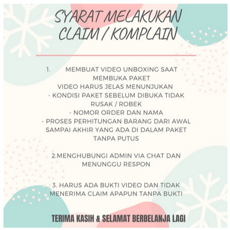 Haloo.. Kak NOTE TOKO : Harap Dibaca Dahulu π Pilih RANDOM !!! artinya tidak bisa ganti motif yah kak π₯°jadi jangan dipaksakan π jika kakak ingin motif maka pilih lah motif.. π Barang Ready Semua yah Kakβ¦ Jadi Langsung dipilih ajaβ¦. Tidak boleh lama-lama Langsung halal kan saja kak.. π π Jika Motifnya Kosong Langsung Chat aja kakβ¦ Kami siap melayani dengan Senang hati π π WAJIB Menyertakan VIDEO UNBOXING apabila ada KERUSAKAN BARANG atau KESALAHAN BARANG π JANGAN LUPA berikan bintang 5 ya kak , bila kakak puas dengan produk kami π Pengiriman Setiap Hari Senin - Sabtu, Kami selalu konfirmasi jika Motif tidak pada hari itu juga, Jika dalam 1 hari tidak ada jawaban maka akan kami kirim randomβ¦ yah kak π PESAN Batas transfer pengiriman sampai jam 2 siang. Lebih dari itu ikut pengiriman berikutnya. Trima kasih :)