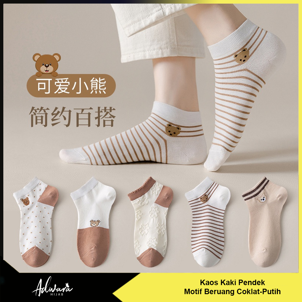 Adwara Hijab menyediakan kaos kaki pendek semata kaki untuk wanita dengan gaya fashion korea motif beruang coklat, kaos kaki ini terbuat dari bahan katun yang adem dan lembut sehingga nyaman digunakan.