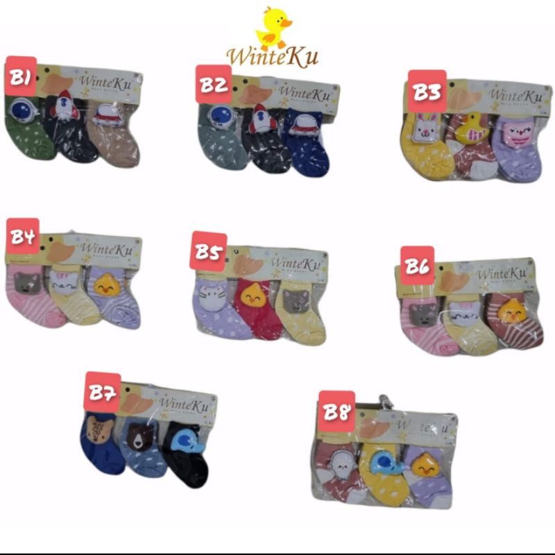 Kaos Kaki Winteku SNI (isi 3pcs) seri 3 Price: IDR 12.000,- (3 pasang kaos kaki / 1 pak) Size: 0-6 Bulan Motif: NB1-NB11 Isi 3pcs kaos kaki
