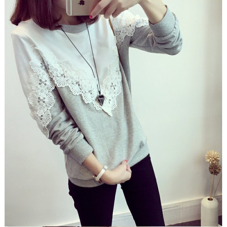 Nama: Kaos Lengan Panjang Kaos Renda T-Shirt Leher Bulat Kaos Casual Santai Kaos Longgar Ukuran Besar