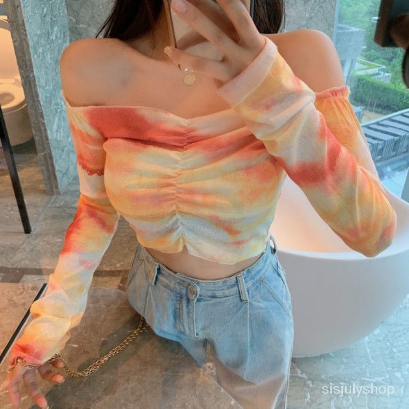 Detail Kaos Lengan Panjang Wanita Musim Semi dan Musim Gugur 2023 Off-Bahu Kerah Satu Kata Atasan Bawah Pen