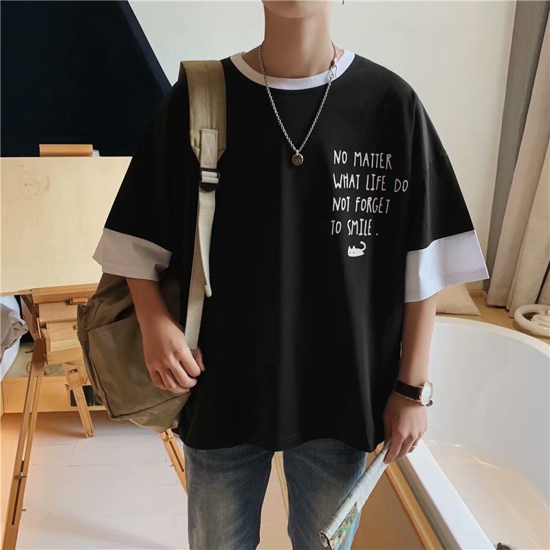 Detail kaos oversize pria kaos korean style round neck Lengan Pendek baju kaos kasual modis loose shirt murah T-Shirt kaos hitam
