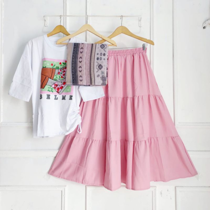Kaos Combed Serut Set Rok Susun Moscrepe Premium + Hijab Voal Motif
