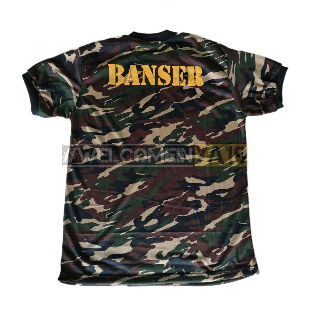 Bahan : PE Single Ukuran : One Size fit to L besar Warna : Loreng Banser Spesifikasi : Sablon Logo di depan dan tulisan Banser di belakang, Rib karet di leher dan lengan kaos
