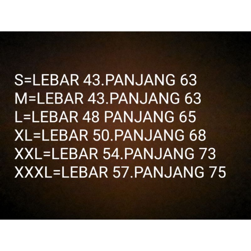 (UKURAN PANJANG LEBAR BAJU) S. LEBAR 43.PANJANG 63 M. LEBAR 43.PANJANG 63 L. LEBAR 48.PANJANG 65 XL.LEBAR 50.PANJANG 68 XXL. LEBAR 54.PANJANG 72 XXXL. LEBAR 57.PANJANG 75
