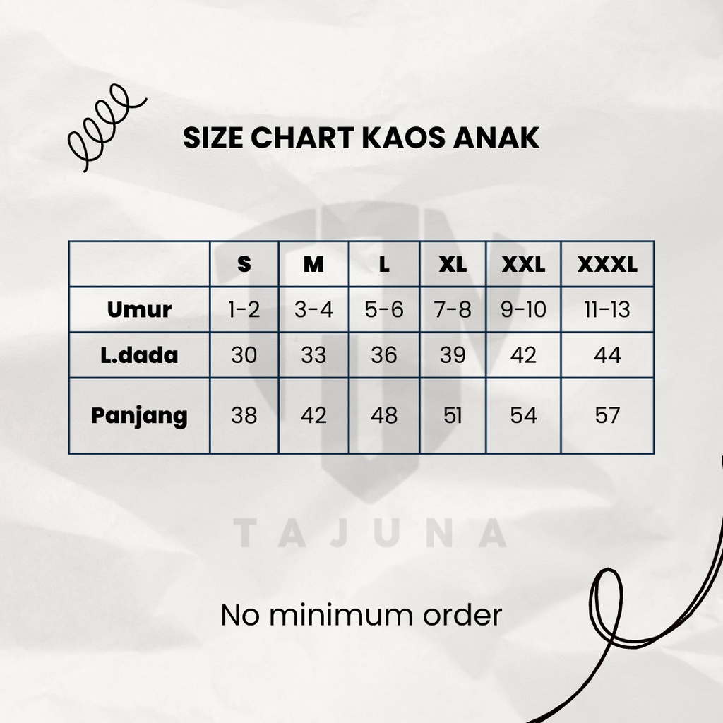 SIZE CHART ANAK Size S LD 30cm x PB 38cm Size M LD 33cm x PB 42cm Size L LD 36cm x PB 48cm Size XL 39cm x PB 51cm Size XXL LD 41cm x PB 54cm size 3XL LD 43cm x PB 56cm LD=Lebar Dada PB= Panjang Baju
