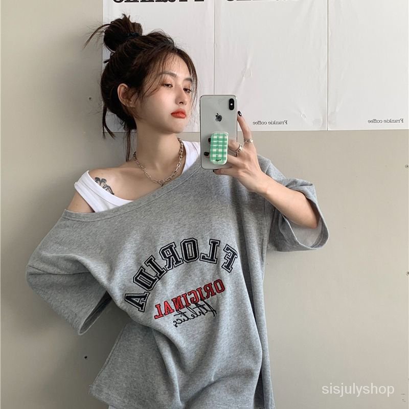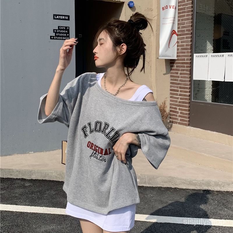 Detail Kaos wanita longgar versi Korea dari bagian panjang atasan lengan pendek angin malas yang baru di pa