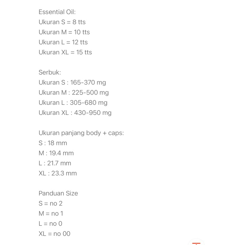Essential Oil: Ukuran S = 8 tts Ukuran M = 10 tts Ukuran L = 12 tts Ukuran XL = 15 tts