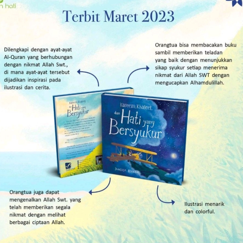 Judul Buku : Kareem, Khaleel, dan Hati yang Bersyukur Penulis : Junissa Bianda Ukuran Buku : 26.5 x 26 cm Jumlah Halaman : 34 halaman Cetakan : I, Maret 2023 ISBN : 978-623-6944-15-8