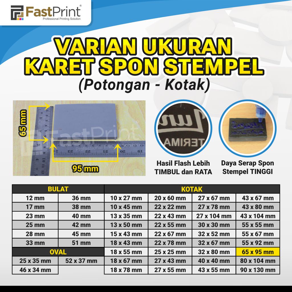 Fast Print menyediakan Karet Spon Stempel Flash dalam bentuk potongan sesuai ukuran Gagang untuk memudahkan Anda tanpa perlu memotong Karet Spon Stempel Flash satu persatu.