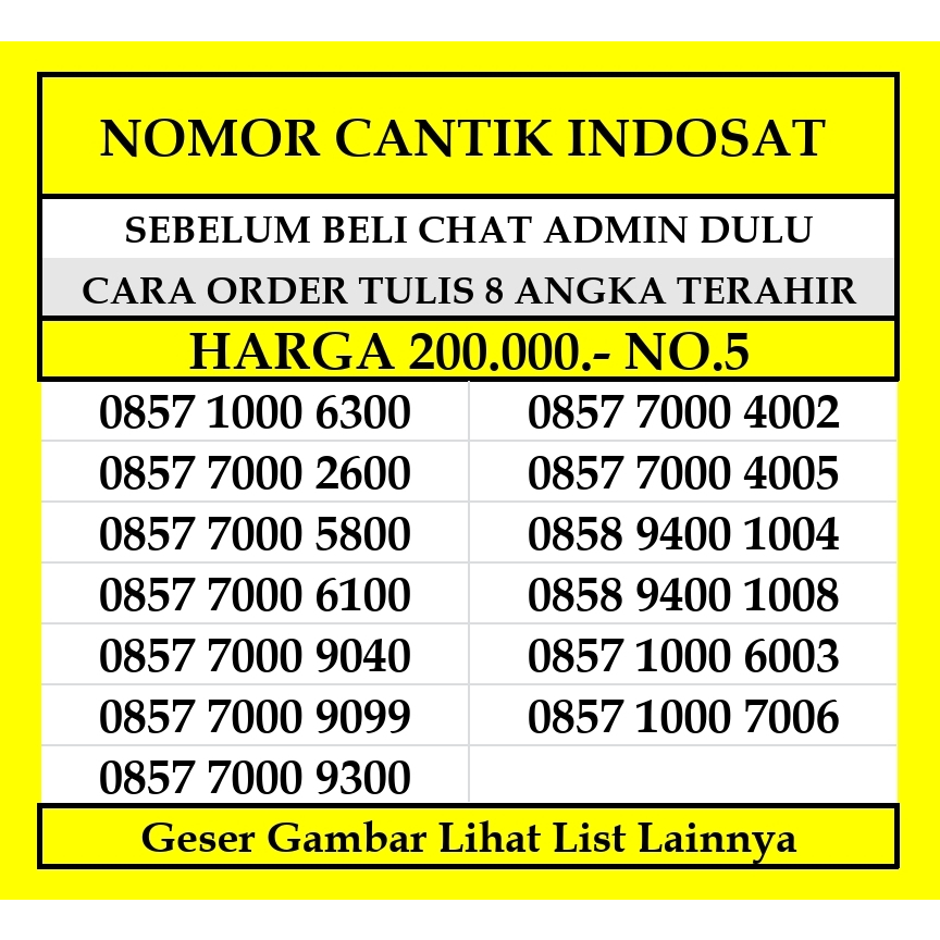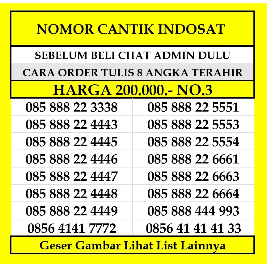 - Tanyakan Stok / List Nomor yg ready Dahulu ya !!! - Pembeli yg order tanpa tanya stok dan nomor yg di order sudah terjual, maka kami akan mengirimkan nomor lain yg masih tersedia di list - Ukuran Cip 3 in 1 (sim, micro, nano) - Dapat Digunakan Diseluruh INDONESIA - Setelah paket di terima pembeli wajib melakukan registrasi ke 4444 sesuai No NIK dan No KK pribadi
