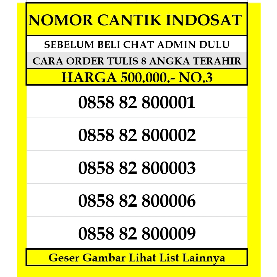 - Tanyakan Stok / List Nomor yg ready Dahulu ya !!! - Pembeli yg order tanpa tanya stok dan nomor yg di order sudah terjual, maka kami akan mengirimkan nomor lain yg masih tersedia di list - Ukuran Cip 3 in 1 (sim, micro, nano) - Dapat Digunakan Diseluruh INDONESIA - Setelah paket di terima pembeli wajib melakukan registrasi ke 4444 sesuai No NIK dan No KK pribadi