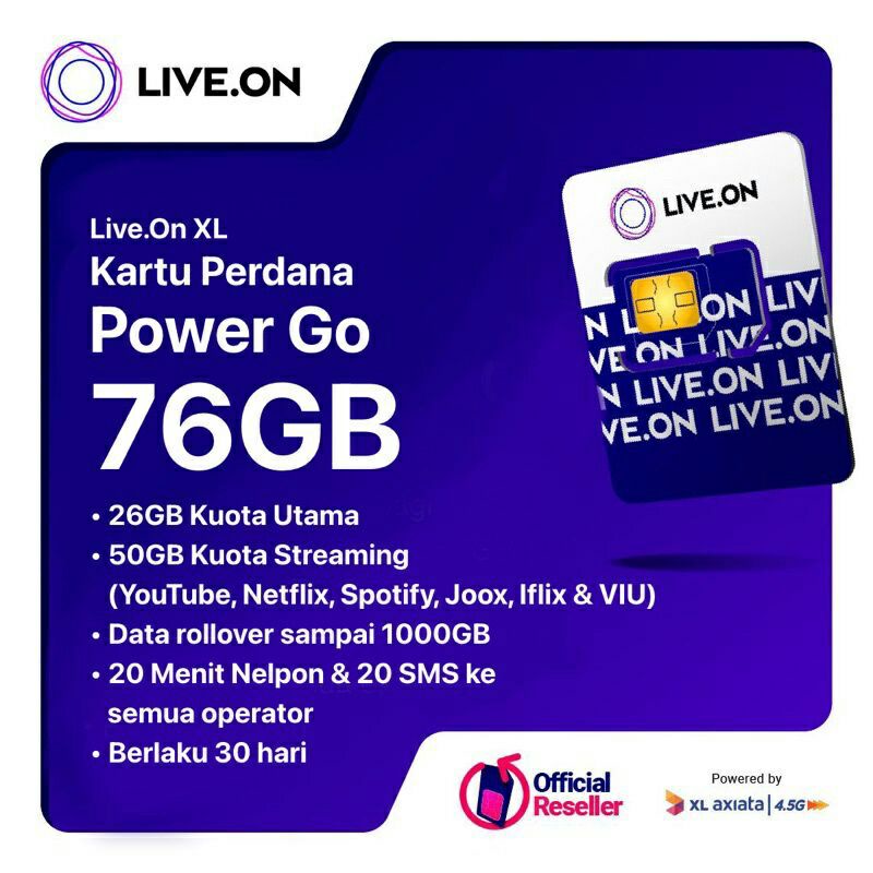 paket berisi: 1.kartu perdana XL live on 2.kuota internet 81gb atau 76gb atau 71gb sesuai variasi kuota yang dibeli dengan rincian: -71gb:70gb dari kartunya dan 1gb bonus log in ke apk live on(variasi 71gb tanpa kode promo) -76gb:70dari kartunya, 1gb bonus log in dan 5gb dari kode promo yang didapatkan dari seller(kode dikirim via chat) -81gb dari kartunya, 1gb bonus log in dan 10gb dari kode promo yang didapatkan dari seller(kode dikirim via chat) 3.20 menit nelfon ke semua operator 4.20 SMS gratis ke semua operator 5.kuota rollover sampai 1000gb 6.ejektor kartu SIM