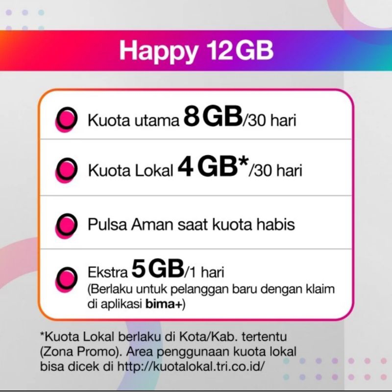 Produk: Kartu perdana Happy (Ready Stok Terus) 3 GB Nasional + 3 GB Lokal 5 GB Nasional + 3 GB Lokal 8 GB Nasional + 4 GB Lokal 18 GB Nasional + 10 GB Lokal