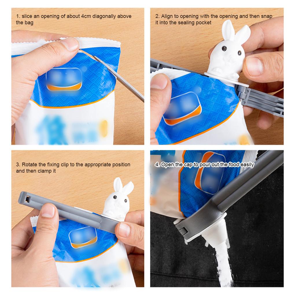 Ramah pengguna: Penjepit penyegel ini dirancang dengan nosel cerat di ujungnya, sehingga Anda dapat langsung mencurahkan makanan tanpa melepas penjepit.