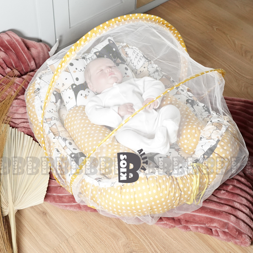 KASUR BAYI BABY NEST PREMIUM DENGAN KELAMBU + FREE BANTAL PEYANG DAN GULING BAYI (BISA 2 SISI MOTIF BOLAK BALIK)