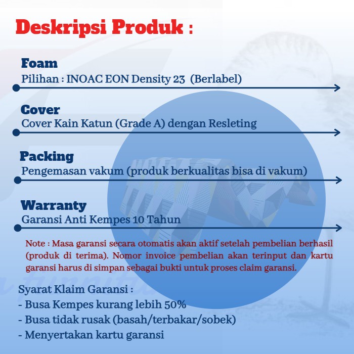 Note : - Kartu garansi di baca dan di simpan untuk bukti claim - Ukuran sesuai, harap menunggu proses pengembangan kasur setelah dibuka dari packing vakum ± 72 jam - Tidak diperkenankan untuk menyimpan kasur dalam keadaan vakum terlalu lama (maksimal 3 minggu) - TIDAK MENERIMA COMPLAIN tanpa bukti berupa video open pack dan foto resi yang jelas. Jadi pastikan anda melakukan video dan foto produk sebelum membuka.