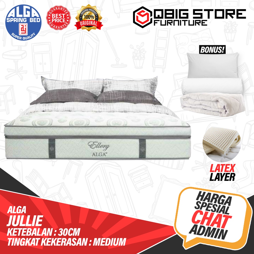 Alga Jullie Pillow Top Alga Jullie dengan Pillow Top Premium Natural Latex Layer. Berbalut kain import belgium dengan kualitas rajut halus dan tebal (non allergic anti dustmite). Alga posture support Foam (high density foam) Foam yang di design khusus untuk menopang tubuh dan memungkinkan penyelarasan kepala, bahu, dan pinggul yang tepat untuk kesehatan tulang belakang yang lebih baik. Alga posturize spring (menggunakan high tensile carbon steel) yang mampu memberikan daya topang maksimal bagi setiap rentang badan, jaminan menopang tulang punggung secara sempurna dari berbagai posisi tidur maksimal.