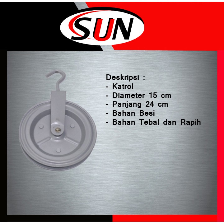 Deskripsi : _x000D_ - Katrol / Kerekan _x000D_ - Diameter 15 cm _x000D_ - Panjang 24 cm_x000D_ - Dilengkapi Gantungan _x000D_ - Warna Tergantung Persediaan_x000D_ - Bahan Besi.Tebal_x000D_ - Kuat dan kokoh_x000D_ _x000D_ ---------------------------------------------------------------------------_x000D_ _x000D_ Katrol / Kerekan biasa digunakan untuk mengangkat barang dari bawah atau ke atas. Umumnya digunakan dalam kerekan air sumur ataupun dalam proyek pembangunan untuk mengangkut barang barang ke atas._x000D_ _x000D_ Salam, _x000D_ Sun Hardware