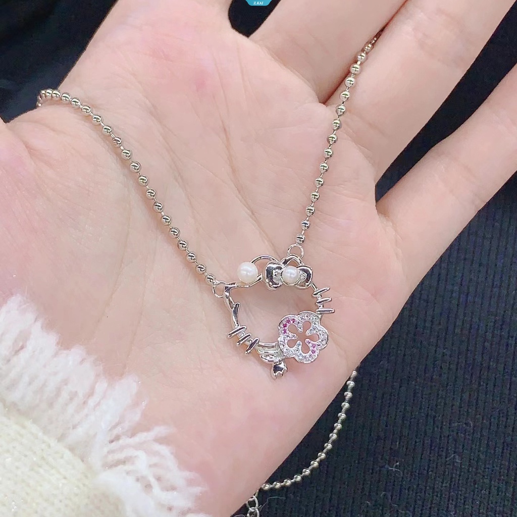 Kawaii Sanrio Hellokittys Baru Segar Dan Indah Merah Muda Flash Kristal Peach Perak Disepuh Perhiasan Bunga Sakura Bunga Wanita Liontin Kalung [ZK]