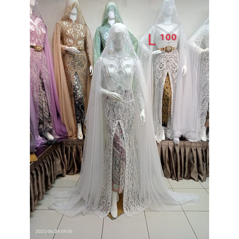 Pakaian Wanita > Wedding Dress > kebaya pengantin akad nikah full Payet depan belakang mobil belah satu set rok selayer bahu kerudung)