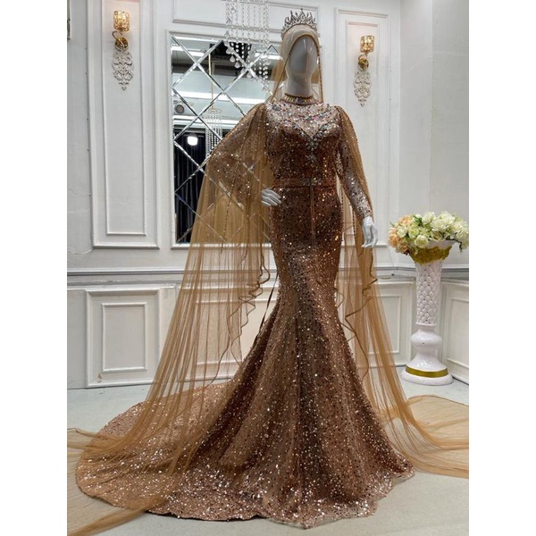 gaun pengantin slim Duyung full Payet ekor pisah free manset