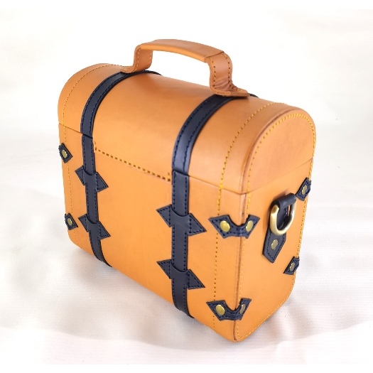 DESKRIPSI PRODUK - Material : Vegetable tanned cow leather - Colour : Camel - Midnight - Size : W. 21 x D. 9,5 x H. 18 cm - Actual weight / without packaging : 0,5 kg - Feature : * Unique vintage treasure trunk design * 2-tone colour * Polyester fabric inner lining * Vintage hook closure * 1 zipped pocket inside * Removable adjustable strap ** Colour may vary due to lighting and natural characteristic of each leather **