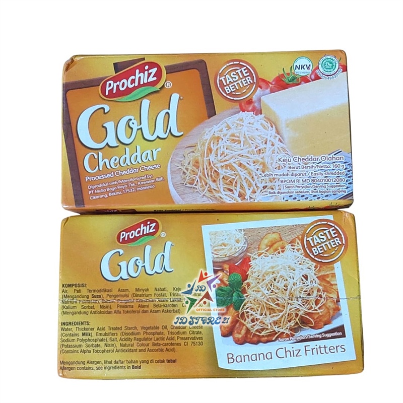 PROCHIZ Gold merupakan keju cheddar olahan dengan menggunakan bahan baku berkualitas dan mengandung susu memiliki rasa gurih, asin, dan enak.
